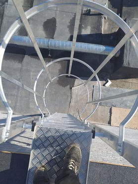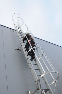 Volgens ISO 14122-4 met betrekking tot permanente toegangsmiddelen tot de machines, moet een weegschaal groter dan 2,5 meter (op de mast eronder) voorzien zijn van een beschermende hoepelrok of een veiligheidsrail . In plaats van de rugprotector hebben we gekozen voor het meest veilige en betaalbare systeem: de ladder met geïntegreerde rail (verticale securail).